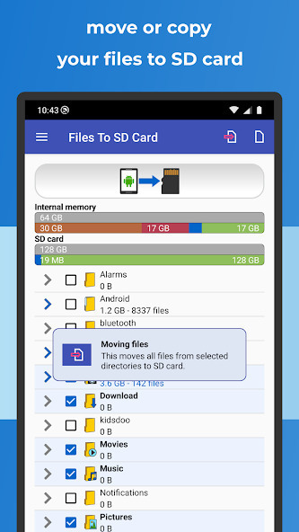 Get ready to free up space, move, or copy your directories or folders with the efficient and user-friendly "Files to SD Card" app.