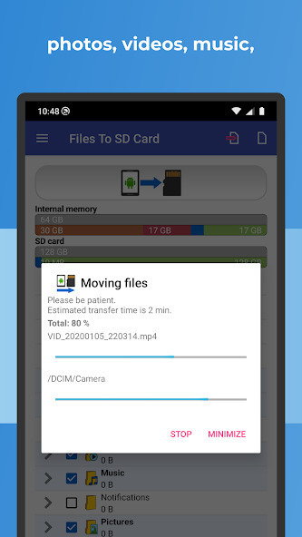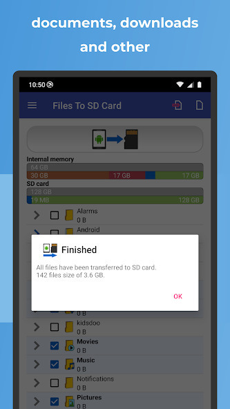 Optimize your Android device's storage space and effortlessly manage your files with the powerful "Files to SD Card" app. Move, copy, or backup various files like photos, videos, music, downloads, and documents from your device's internal memory to your phone's SD card or USB OTG drive with ease.