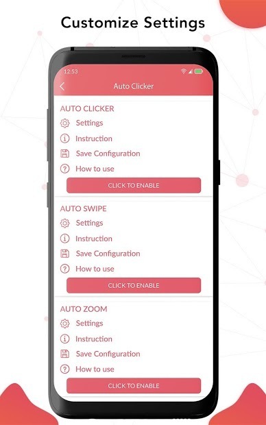 Пользователи могут создавать собственные настройки смахивания, такие как время задержки, количество повторов (раз), продолжительность (минимум 690 мс), защита от обнаружения и т. Д. В этом приложении есть функция под названием модуль смахивания, они могут установить продолжительность смахивания вверх до 300 - 60000 мс через настройки приложения.