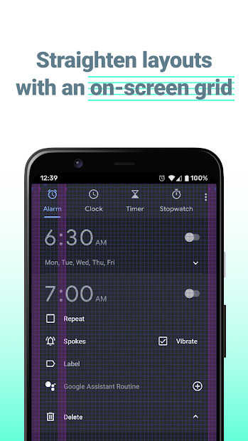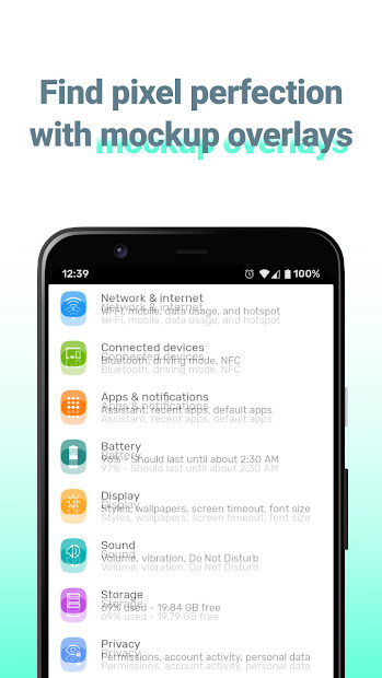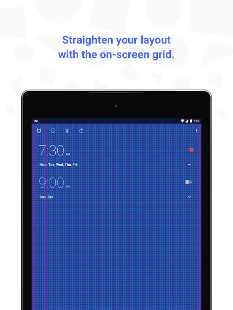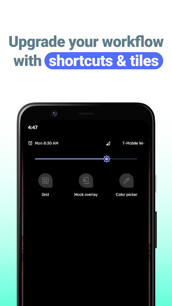 Mockup Overlay - Display a mockup image over your app. This gives you a high-fidelity opportunity to see how the design spec matches the developed user interface. Choose from portrait or landscape overlays and tune the opacity for an effective comparison.