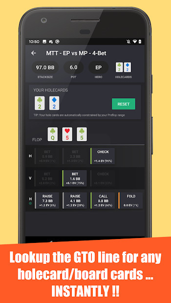 Your personal GTO postflop lookup assistant and poker engine AI solver in your pocket. No need for complex tree building and then buying grunty super computers to run postflop solves. We did all the hardwork and making it accessible to you via a few clicks on your mobile phone. Just pick a spot, enter your hole cards, the board and viola! You can see the GTO line for all possible turn and river with the exact frequencies and EVs.