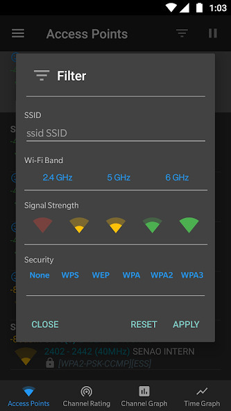 - Доступные фильтры: диапазон WiFi, мощность сигнала, безопасность и SSID