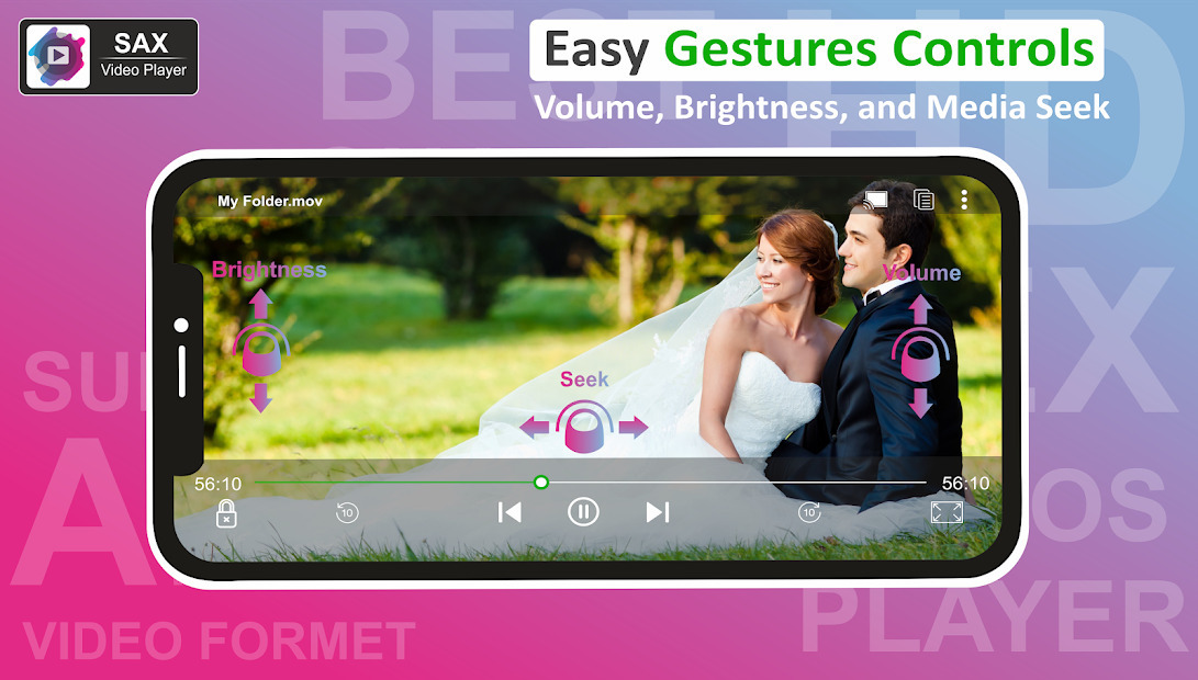 Enjoy every moment to watch any video , movies etc.. and SAX Video player supports almost all video formats including AVI , MOV, MP4 , RMVB , MKV , 3GP , M4V , MPG , WMV etc, just depends on your phone or tablet .