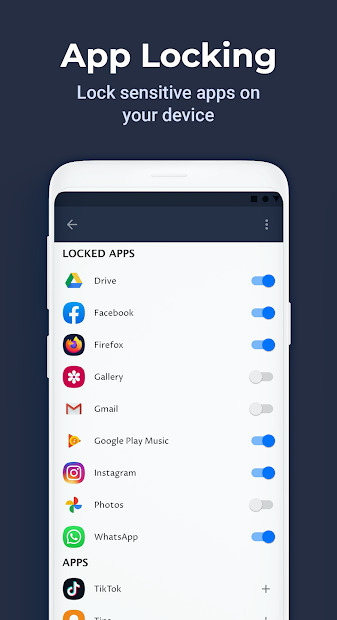 The mobile app locker lets you lock apps with a custom password to avoid others having access to them, increasing app security and privacy.